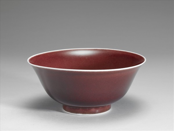 圓口,弧形深壁,平底,矮圈足。全器施寶石紅釉,如圖冊說明所言,釉表可見形如橘皮棕眼的氣泡。施釉至足邊,口沿及足邊各留一道白邊,足緣無釉露白胎。足內壁及底施白釉,底有「大明宣德年製」六字楷體暗款,外加雙圈。