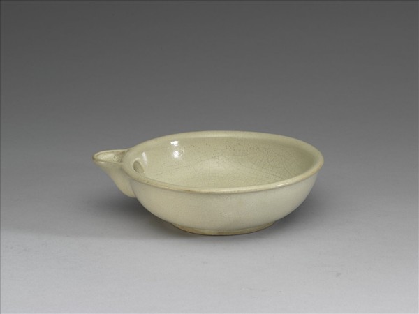 圓口捲邊,淺弧形壁,短流,平底,矮圈足。通體施白釉,釉色泛青黃,施釉至足邊,底緣無釉露白胎。