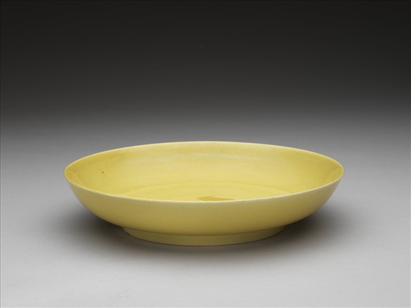 敞口,淺壁弧形,矮圈足。胎質較薄,器內外壁滿施嬌黃釉,盤底純白,樸素無紋飾。底有青花書「大明弘治年製」六字二行楷款,外加雙圈。