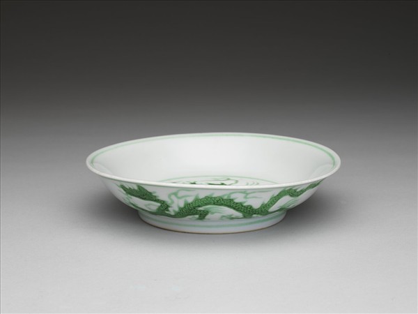 侈口,淺壁弧形,矮圈足。薄胎白釉,盤心及外壁刻畫雲龍三條,加填綠彩。外壁隙地淺劃波濤紋。口足內外分畫綠線四道。底有青花書「大明正德年製」六字二行楷款,外加雙圈。
