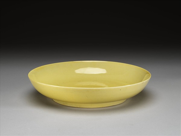 敞口,淺壁弧形,矮圈足。胎質較薄,器內外壁滿施嬌黃釉,盤底純白,樸素無紋飾。底有青花書「大明弘治年製」六字二行楷款,外加雙圈。
