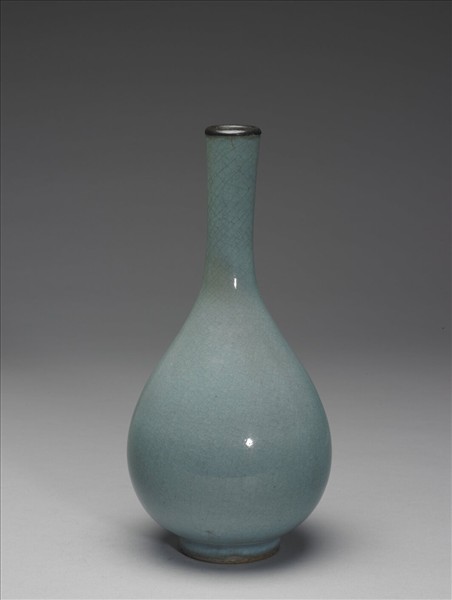 此件作品小口微敞,口沿鈐銅釦,細長頸,膽形腹,腹部下垂,通體罩施天青色釉,釉質瑩潤晶亮,釉表開透明細紋片,施釉至足際,圈足外壁、足底緣無釉處,皆加塗赭色護胎釉,外底局部有刮痕。長頸瓶為宋代北方窯場盛燒的瓶式之一,在定窯及耀州窯中皆曾出現相似的造型;證之田野考古,甘肅華池縣宋代窖藏、北京懷柔縣亦有出土。北京故宮博物院收藏的月白膽瓶,以及英國大衛德基金會之天青紫斑膽瓶,即與甘肅華池縣、北京懷柔縣出土者同一樣式。院藏天青膽瓶則與河南鶴壁集出土者相似,而略異於北京懷柔縣或甘肅華池縣之出土物。但從天青膽瓶頸部隨著直線上昇略漸外敞的情形看來,其原型亦當如前述作品,瓶口略外敞,有一道唇邊。至於天青膽瓶的年代,因頸、腹線條猶同華池縣的青釉刻花瓶,華池縣窖藏伴出物龍泉青瓷荷葉蓋罐為金、元之物, 故窖藏之定年或介於金、元之際。另一方面,天青膽瓶之瓶式完全迥異餘閻德源墓、馮道真墓之長頸瓶,閻墓定年於1190年左右,馮墓墓主馮道真葬於元至二年(1262),故兩墓所出造型相似的長頸瓶,皆為十二世紀後半葉以後的作品。在考慮天青膽瓶介諸華池縣出土物與閻、馮兩墓長頸瓶之間的情況,此件作品遂定年於金。