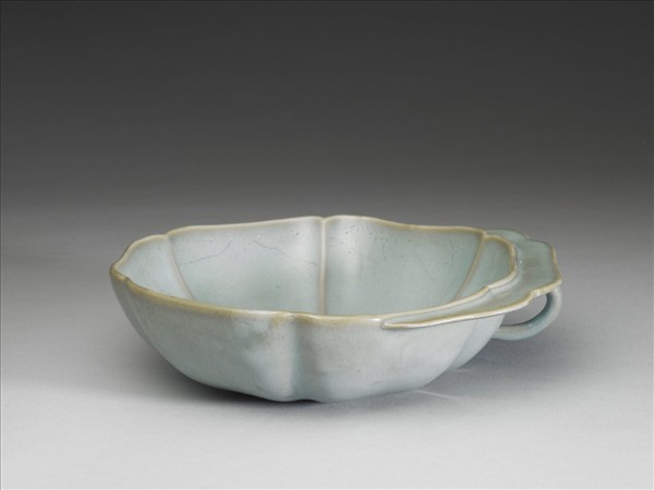 侈口、六瓣葵花式碗,淺壁,平底;右側口沿平折,作三瓣花式寬板沿,其下有細圓條半環形把手。全器施略泛灰濁的天青釉色,釉間鬃眼多,釉色流動間有細線狀的蚯蚓走泥紋;而釉的流動使葵瓣的稜線在灰藍釉中呈現淡黃沉靜的色調。器底有三個支釘,與同是天青釉的汝窯的支燒習慣相似;此種單色乳濁鈞窯系列的釉質在臨汝曾發現窯址,凡其窯與附近燒製汝窯瓷器的寶豐窯址相距不遠,則此中鈞、汝關係頗耐人尋味。此種單把杯應即所謂「屈卮」,在南北宋官方國宴中皆曾使用,也曾在金代高官墓葬中發現,是飲酒的用器;板沿有寬窄之別,耀州窯、官窯、龍泉窯、定窯皆有同類造形的製作;此件器葵瓣隨形圓轉,釉色隨凹凸深淺,是頗具造形美的酒具。