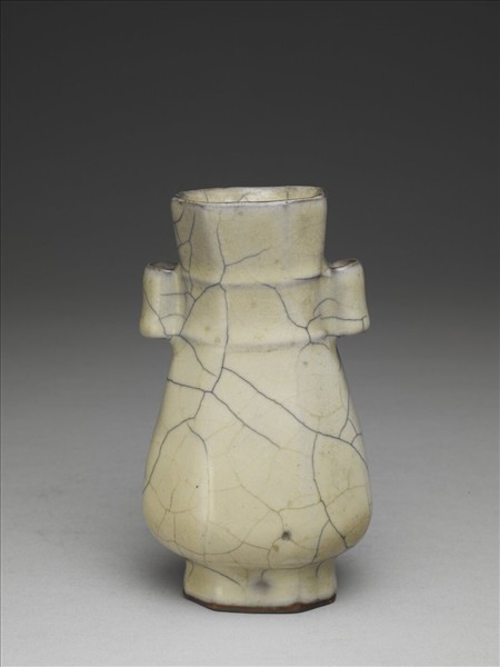 侈口,扁體八稜面形器身。長頸,頸兩側按置兩個管形耳,上下加飾弦紋二道,腹部上斂下豐。圈足微外撇,亦作八方形。採墊燒法燒製,內外施青釉,呈色米黃帶灰,稜邊釉薄處露出灰色邊,釉表帶灰黑色紋片。施釉至足際,足端無釉塗赭色薄汁。南宋潘孟光墓(1275)出土有六個稜面的雙耳扁瓶,此器不僅與之不同,也和南宋官窯的扁圓體貫耳壺有別。因考量安徽省繁昌縣新港街道元代窖藏所見相似器形,加上器身作六個或八個稜面造型的器類,亦見於元朝青銅器和青花瓷之列,故推測或是元朝時流通於相異質材和不同窯口之間的一類器式。