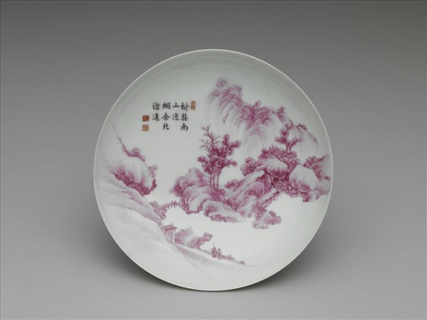 斂口,淺弧壁,矮圈足。器內壁以白釉為地,以紅料繪飾山水景觀,在遠山近樹間可見房舍數間,兩位人物在小徑上對話,空白處以墨書題句:「樹接南山近,煙含北渚遙。」詩句前後以硃紅描繪「壽如」、「山高」、「水長」三印。外壁以淺黃綠釉為地,彩畫靈芝、蝙蝠及纏枝花卉,下飾波濤、山石等吉祥圖案,外壁圖案上下各有黑線一道。圈足內外施白釉,足外牆畫藍料回紋一圈。器外底有「乾隆年製」四字雙行雙方框青花宋體楷書款。乾隆朝瓷胎畫琺瑯承襲雍正朝樣式,依花卉、山水類別題詩、鈐印,詩文則多引用唐宋或明代名詩,本件詩句引自唐代李嶠詩作。本件與故瓷13989形制、大小、款識相同,紋飾極相似,但碟內紅料山水布局略呈左右相反,本件繪有人物,故瓷13989則無。