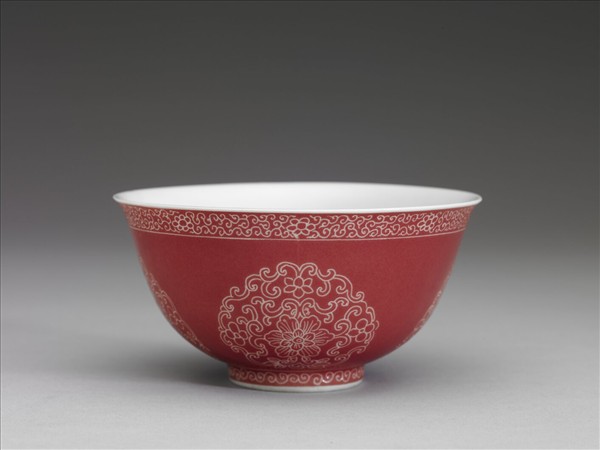 琺瑯彩洋紅地剔花團花紋碗