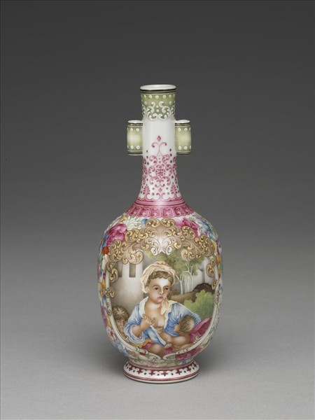 斂口,直長頸,深腹,矮圈足外撇,頸飾兩管狀貫耳。全器外壁以琺瑯彩用西洋明暗技法彩繪紋飾,腹部兩面開光,彩畫西洋仕女戲嬰圖為全器主紋。外壁各層紋飾依序為:口沿下畫兩圈黑線,並以墨綠色為底,飾以圈點紋及圖案花邊,兩貫耳亦配以同樣顏色,並於上下端加飾黑線與圈點紋;頸部並以深桃紅色繪飾圖案化的卷葉紋。器腹兩面開光,開光以類似西洋洛可可藝術風格之邊框圍起,營造出畫框之感。開光內彩畫西洋仕女擁著一嬰孩,後面立一幼童,背景為西洋建築庭園。兩開光內圖案細節略異,布局略呈左右相反。器腹隙地彩畫四季花卉及圖案花邊,足圈飾花邊一道。器外底以藍料書「乾隆年製」四字雙行楷款,外加雙方框。圈足足端無釉。本件與故瓷13998形制、大小、款識相同,紋飾大同小異,僅開光內人物圖案細節不同。