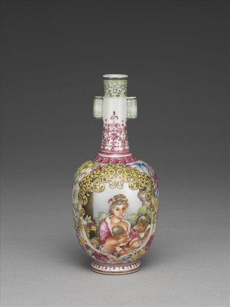 斂口,直長頸,深腹,矮圈足外撇,頸飾兩管狀貫耳。全器外壁以琺瑯彩用西洋明暗技法彩繪紋飾,腹部兩面開光,彩畫西洋仕女戲嬰圖為全器主紋。外壁各層紋飾依序為:口沿下畫兩圈黑線,並以墨綠色為底,飾以圈點紋及圖案花邊,兩貫耳亦配以同樣顏色,並於上下端加飾黑線與圈點紋;頸部並以深桃紅色繪飾圖案化的卷葉紋。器腹兩面開光,開光以類似西洋洛可可藝術風格之邊框圍起,營造出畫框之感。開光內彩畫西洋仕女擁著一嬰孩,後面立一幼童,背景為西洋建築庭園。兩開光內圖案細節略異,布局略呈左右相反。器腹隙地彩畫四季花卉及圖案花邊,足圈飾花邊一道。器外底以藍料書「乾隆年製」四字雙行楷款,外加雙方框。圈足足端無釉。本件與故瓷13997形制、大小、款識相同,紋飾大同小異,僅開光內人物圖案細節不同。
