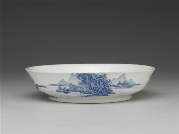 侈口窄唇,淺壁,矮圈足。盤內壁樸素無紋飾,器外壁在白釉地約三分之二區域畫藍彩山水樓閣圖,藍料深淺濃淡有致,餘留白區域有墨書題句:「樹接南山近,煙含北渚遙。」詩句前後以紅料描繪「壽如」、「山高」、「水長」三印,三印章法不同。器外底有藍料書「雍正年製」四字二行宋體楷款,外加雙方框。全器通體施釉,足端與口沿呈淡黃色。清代雍正朝瓷胎畫琺瑯器依花卉、山水類別題詩、鈐印,詩文則引用唐宋或明代名詩,本件詩句出自唐代李嶠詩作,詩句內容與器壁所繪山水州渚風景相映成趣;本院所藏多件雍正、乾隆朝磁胎瓷器皆題有此詩。本件與故瓷13999形制、大小、款識相同,紋飾極相似,但兩件外壁藍料山水布局略呈左右相反,紋飾細節略異。