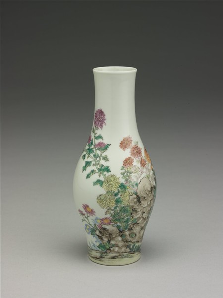 形似橄攬,頸略長,平底,矮圈足。瓶面彩畫各色菊花,紋飾旁加飾題句︰「秀擢三秋幹,奇分五色葩」。及「高致」、「碧霞」、「秋冰」三枚閒章。底藍料書「乾隆年製」四字楷款,外加雙方框。