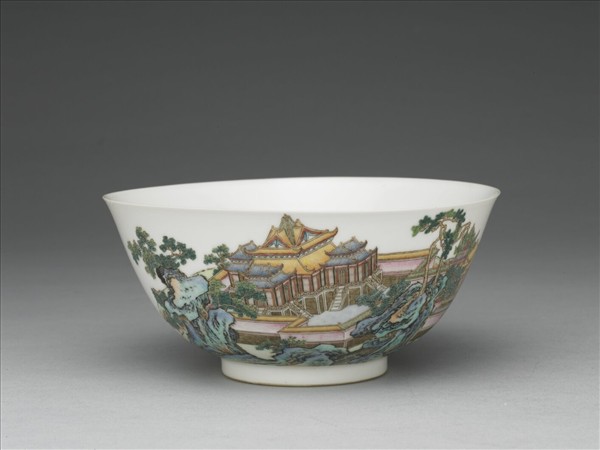 仙山樓閣為乾隆琺瑯彩瓷的新畫題,碗外金碧樓閣沿著弧壁修砌,青綠山石與蒼翠樹木點綴其間,營造出一個與世隔絕的仙境。天際飄浮的雲腳及遠山的波渚,將觀者的視線指引至「仙樓綺閣環瀛漢」的主題,題句前後依舊以紅料描出「壽如」、「山高」、「水長」的印文,碗底有藍料書寫的「乾隆年製」四字宋體楷款。乾隆二年、三年、四年、七年、十五年、十八年及十九年,景德鎮御窯廠皆曾燒造琺瑯彩瓷,品目中也清楚的出現有「磁胎五彩樓台殿閣宮碗一對」。燒好的琺瑯彩瓷,廣木作並且為之配裝木匣,在木匣上記錄各件作品的品名及完成的年代,皇帝也下令將這些作品送往乾清宮收存。從中不難窺見琺瑯彩瓷受到清廷珍視與喜愛的程度。尤其核對《乾清宮琺瑯、玻璃、宜興瓷胎陳設檔》,甚至能逐一地比對出傳世品與帳冊登入的物件,進而證實清宮燒造琺瑯彩瓷的史實,以從中觀察康熙、雍正、乾隆三朝琺瑯彩瓷在繪畫題材上的轉變。