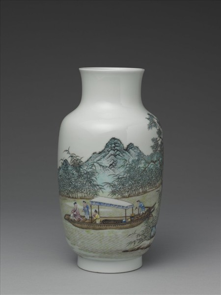 瓶口微撇,寬頸,溜肩,圓直腹,近足處漸斂,圈足。通體白釉地上施琺瑯彩,圖繪山水人物,湖中一帶篷小舟上,一文人坐於船頭,船內几上置琴一張,三僕隨侍,一於舟後備茶,茶罏上置茶壺,傍並有茶葉罐及貯水罐,舟上並放有書籍,一幅徜徉湖上,烹茶、讀書、彈琴,欣賞湖光山色的愉悅景象,也是品茗的最佳情境。底青花書「大清乾隆年製」三行六字篆款。瓶肩空白處隸書仿題乾隆御製詩一首:「陂塘曲復曲,盪槳出叢蘆。晴旭依徹際,秋煙滿一湖。」詩句後落「乾隆宸翰」、「惟精惟一」紅篆方印兩章。整體佈局恰到好處。乾隆皇帝喜愛文人品味,泛舟煮茶為唐宋以來文人或畫中常見的題材,此瓶也是乾隆皇帝多樣品茗生活的寫照。