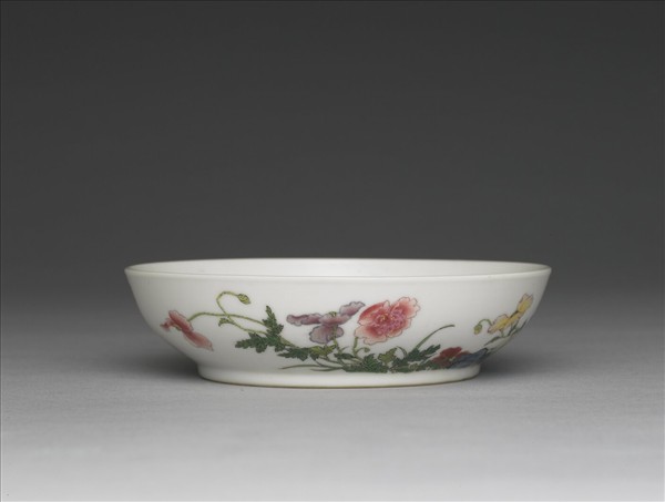 此碟廣口、淺壁、矮圈足。釉面潔白,以琺瑯彩繪飾,色淡雅。腹部繪有花卉草石一景,花卉俯仰開合,枝葉捲曲纏繞,搖曳多姿,設色濃淡柔嫩,使全景益顯生動自然。腹部另側有墨書題句「宿雨那經舞袖垂」,為明人徐茂吳〈虞美人花詩 〉詩句,以及三個紅料繪印「佳麗」、「金成」、「旭映」。圈足端露胎,外底面則有藍料書「雍正年製」二行四字仿宋體楷款,圍以雙方框。