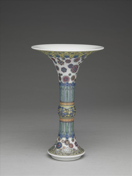 此器形仿商周青銅觚,喇叭口,細長頸,小鼓腹,長脛外撇,平底,矮圈足。口下為黄地幾何式纏枝錦,頸部與脛部於白地上彩繪仰覆蕉葉和各式繡球花,中凸處為黃地藍夔龍紋並上下各飾回文一道。足內白地上藍料書「乾隆年製」四字二行楷款,外加雙框。此器造型和紋飾與故瓷014029相仿,應為成對作品。