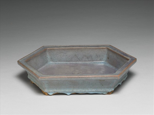 此盆作六邊形,折沿,斜直淺壁,上寬下斂,近足處有一圈凸稜,平底下接六足。釉質濃稠,表面可見稯眼和氣泡,整體釉色藍中顯紫,唯口沿為褐色邊。施釉至足際,釉層邊緣不整,塗有護胎褐色釉,底有陰刻「一」字,略露灰色胎土。