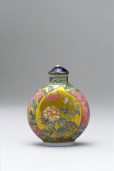 玻璃胎畫琺瑯金地桃實花卉紋鼻煙壺