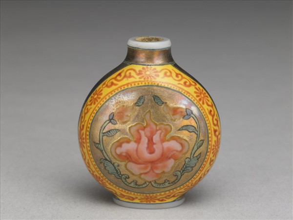 白色半透明玻璃製鼻煙壺,直口,扁圓腹,平底足。腹部兩面皆繪開光,開光內為金地,繪有一朵粉紅牡丹,兩側各帶對稱枝葉與含苞花朵。開光周邊有一黃色寬帶,並繪有一周橘色圓點紋與朵花紋。底篆刻雙行「乾隆年製」。此件鼻煙壺缺蓋與匙。