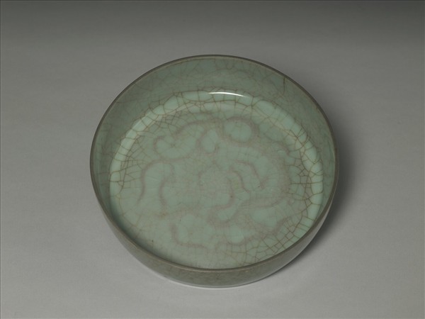 圓口,深壁微外鼓,平底無足。全器滿施青釉,釉色偏綠,釉表滿佈開片,局部有冰裂紋。因採用墊燒法燒製,底面有一圈無釉的「蛇目」痕。口沿有磨釉痕跡,傳世帶木座,底刻「宋汝窯蟠螭洗」、「甲」字,和「古稀天子御玩」。以今日的陶瓷史視野來看,這件作品無疑是南宋官窯,但乾隆皇帝將南宋官窯看成是汝窯,說明他有時候也官、汝不分。