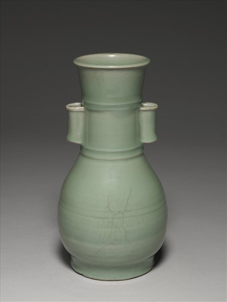 貫耳壺,造型取上古銅壺之意。敞口微撇,長頸、廣腹、圈足。頸部中下段各束以兩道細凸弦紋,並於兩側各立半圓柱的貫耳,耳上下各皆起圓稜。腹部圓鼓而重心在中下段,且多見鏇坯痕跡。有傷裂痕。圈足高,足端無釉,底釉不勻。此類仿銅造型的器皿,在宋代多與祭祀用器相關。