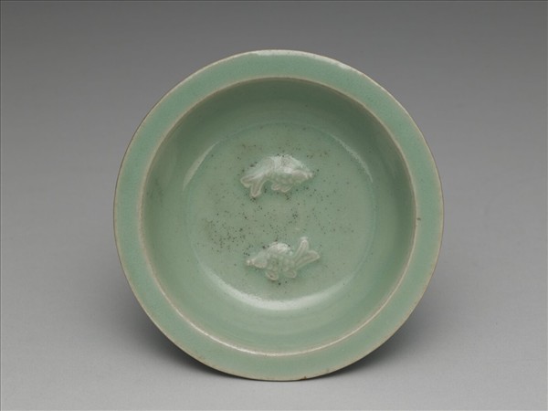 大盤,平折沿微上揚,外壁作凹凸摺稜之直線菊瓣,寬圈足,折沿的內外沿皆有淺稜高起。碗心有模印貼花而成的雙魚紋,外圍以圓圈。釉色瑩碧,足緣露出灰白色胎土,釉層和胎土相接處有一道褐色火線。