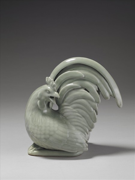 全器形塑成一雄雞,作蹲伏狀,兩翅撲地,尾羽高聳而豐厚。雞首向後回看,瞪眼張口,予人一種雄糾糾、氣昂揚的態勢。胎體稍厚,上施青色釉,釉質透明,釉色帶灰白,全器可從雄雞蹲伏之底板,拆卸成雞身和帶圓筒底座兩個部分。底緣無釉,加塗赭色護胎汁。因此品作為香薰使用,故底座圓筒乃裝香容器,而雞首張口與尾翼出孔的搭配,則為薰香進氣和出香所需而設計。本器為日本作品。