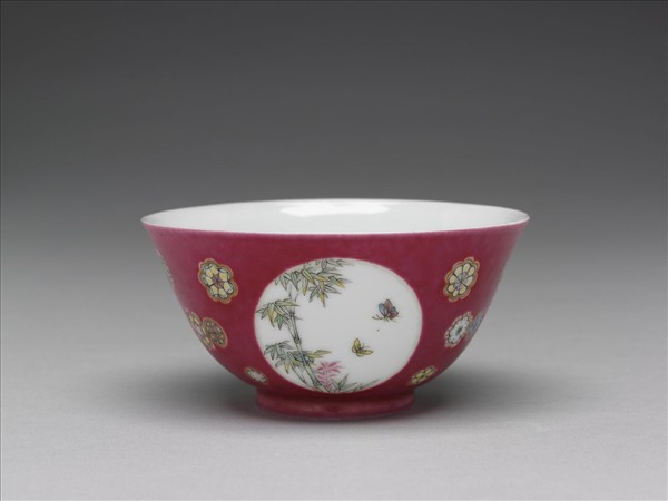 琺瑯彩洋紅地團花開光花鳥紋碗