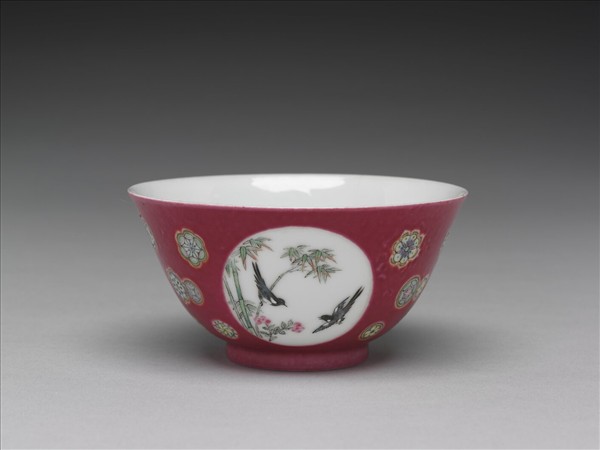 琺瑯彩洋紅地團花開光花鳥紋碗