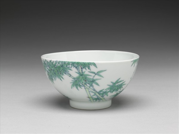 侈口,深弧壁,平底,矮圈足。器內白釉無紋,外壁繪翠竹,紋飾均以青花鉤邊,後填綠彩,有些葉尖填紅彩,以示竹葉枯黃。胎骨略重,胎地瑩潤光潔、透光,器底青花書「大清雍正年製」六字三行楷款,外加雙方框。