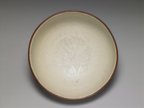 碗,侈口唇邊,深週壁,圓底,矮圈足,帶銅釦。器週內壁及內底淺劃蓮花紋,胎骨較厚,施罩白釉,釉色帶灰,器外釉表有積釉流淌的「淚痕」及縮釉小眼痕跡。外底刻有「穎川記」三字。定窯窯址位在河北省曲陽縣澗磁村、燕山村一帶,窯場廣佈,是宋元時期北方最著名盛燒的白瓷窯場。