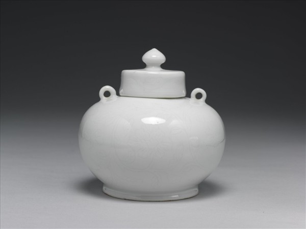 在器肩上帶有二個、三個或四個環形繫耳,是永樂時期瓷器的一個特色。這件罐子小口捲邊,短直頸,圓碩腹,足微外撇,平底。肩部有兩個環形耳。帶平頂直壁子母口蓋,蓋上有花萼形紐。全器施潤潔白釉,腹部淺劃纏枝四季花卉花六朵。蓋上淺劃蓮花,蓋緣有一圈捲草紋。器形相仿但肩部不帶繫耳的白釉小罐,在新安沈船出水品中可以見到。景德鎮珠山遺址曾出土器形相同,不帶蓋的的青花纏枝蓮紋雙繫小罐。