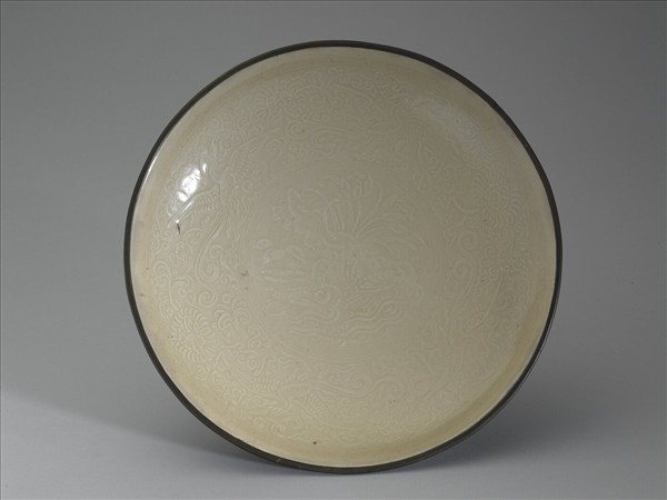 盤,侈口,淺週壁,圓底,淺圈足,帶銅釦。器內壁口沿下印弦紋二道,週內壁印鳳鳥紋二對,間飾牡丹花葉紋,內底心印蓮塘鴛鴦,內底圖案外邊飾弦紋三道。胎骨頗厚,施罩白釉,釉色牙黃帶灰,器表釉面有縮釉小點及積釉流淌的「淚痕」痕跡。定窯窯址位在河北省曲陽縣澗磁村、燕山村一帶,窯場廣佈,是宋元時期北方最著名盛燒的白瓷窯場。