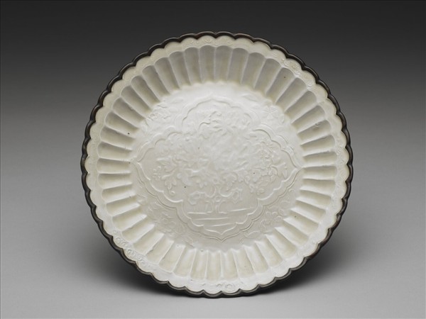 盤,多瓣菊花形,侈口,折沿出唇,淺週壁,平底,淺圈足,帶銅釦。器內折沿唇邊上印雲紋一道,內底心印湖石花蝶,外邊界飾菱花形圈,菱圈外四角各印花卉一枝,器外壁光素無紋。薄胎骨,施罩白釉,釉色白中帶灰,器表釉面有若干縮釉小點痕跡。定窯窯址位在河北省曲陽縣澗磁村、燕山村一帶,窯場廣佈,是宋元時期北方最著名盛燒的白瓷窯場。
