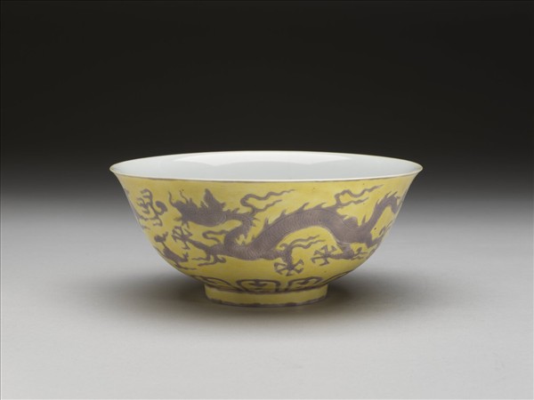 黃地紫彩白裡雙龍戲珠紋碗