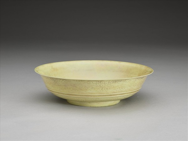 侈口,深壁,矮圈足。盤心淺劃番蓮一枝,外壁劃轉枝番蓮二周,中飾弦紋二道。薄胎骨,釉色淡黃。