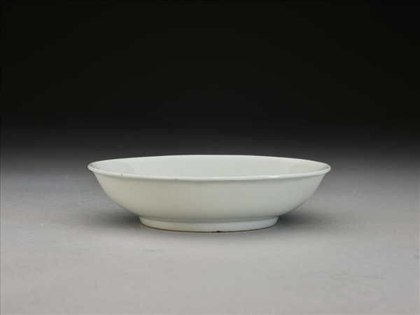 侈口,淺壁,矮圈足。釉色甜白,樸素無紋飾。底有青花書「大明成化年製」六字二行楷款,外加雙圈。