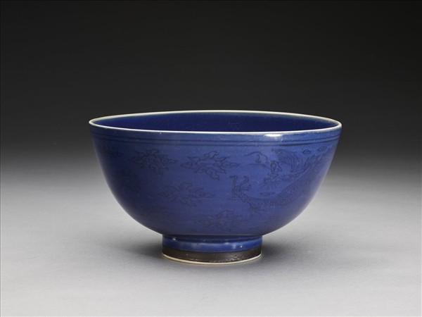 敞口,深壁,矮圈足。外壁劃雲龍兩條,內壁樸素無紋飾。內外滿施深青色釉,口足均露白邊,器底塗有赭色汁。
