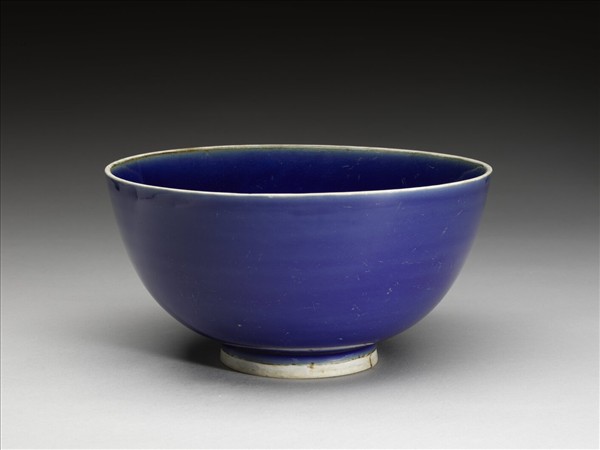 敞口,深壁,矮圈足。內外滿施深青色釉,樸素無紋飾。口足均露白邊,器底塗有赭色汁。
