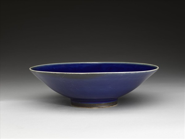 侈口,深壁,矮圈足。器內劃雙龍戲珠紋,外壁樸素無紋飾。內外滿施深青色釉,口足均露白邊,足緣無釉露白胎,足邊與器底塗有赭色汁。