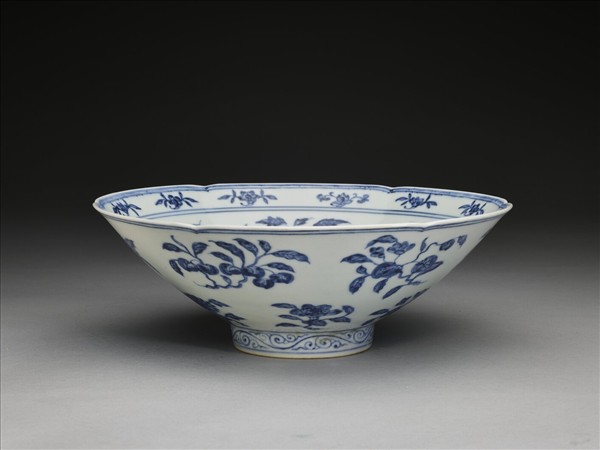 六瓣葵花形口,深壁,矮圈足。碗內口沿下兩道弦紋間畫各種花卉十二朵,內壁畫四季花卉六枝,底心三圈弦紋內畫桃實一枝。外壁口沿下弦紋兩道,器身畫折枝花、果分上下二層各六枝。足壁上下圈畫弦紋兩道,內飾卷草紋一周。底有青花書「大明宣德年製」六字二行楷款,外加雙圈。