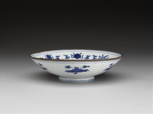 敞口,深壁,矮圈足。口鑲金屬釦,內壁畫轉枝番蓮,加飾八寶,碗心畫如意雲一周,中飾菊花。外壁畫花卉五折枝。內外加飾青線九道。底有青花書「大明嘉靖年製」六字二行楷款,外加雙圈。