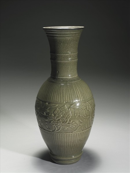 鳳尾瓶,撇口、長頸、橄欖形長腹、小圈足,足上另有一道與足稜略等的凸箍稜。口部以補色泥圈作邊稜,可能原有上段大撇口已傷缺。口下三道密接的凸弦紋,頸中段有弦紋為邊的一道卷草紋,紋難辨識。腹部中段最寬處為剔地拱花轉枝牡丹花紋,端麗而勻整;上下以弦紋為界,各為仰覆長瓣蓮瓣紋。足圈平切,無釉,內牆深斜內收而中空,另以釉接一盤型內底。全器釉色深黯,多細密開片。