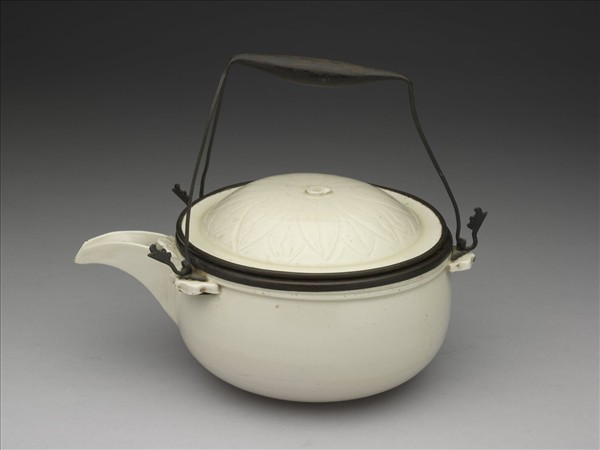提梁壺,器形扁圓,斂口,長流;流壁以泥板方折角接成糟,流無上蓋,僅在流尾飾一雲形貼花,上印「褚」字。口沿下另飾三雲頭,前二後一,釦以銅線,線端彎起為小龍首狀,十分細緻;三線與銅質提梁相扣成丁字形。器蓋微隆起,蓋沿平折,蓋面劃蓮花一朵,以蒂為鈕,十六片蓮瓣四披。蓋器口邊均無釉、鑲銅稜釦。全器滿施牙白釉,質堅,器身薄可透光。