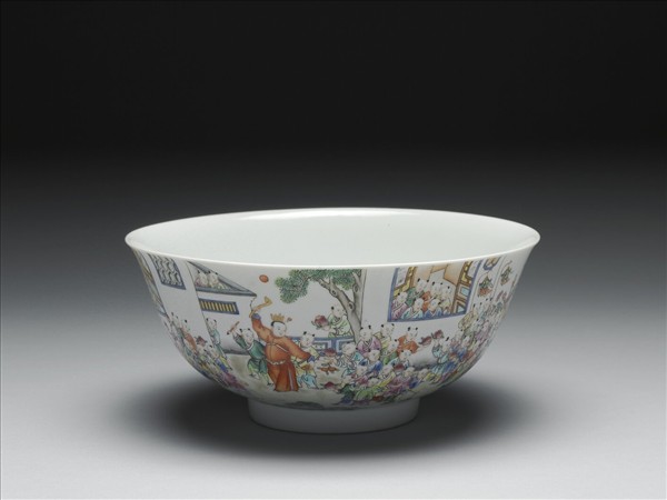 侈口,弧形壁,圈足。通體施白釉,潔白晶瑩,外壁彩繪百子圖,眾多小童在房舍、花園、小橋溪水邊嬉戲,神態豐富多樣,手持桃實、蓮花、毛筆、戟、旌、炮竹等吉祥物,與空中蝙蝠呼應,中有著官服者手持如意、元寶與眾小童同戲。筆觸精細生動,色彩繽紛得宜,實屬佳品。底心蓋紅釉「大清嘉慶年製」六字二行篆款。