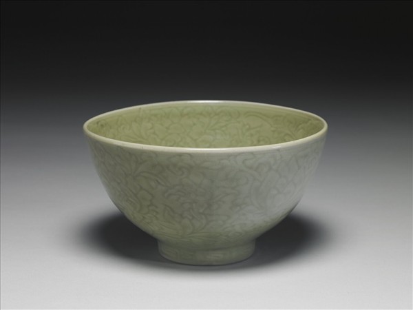 敞口碗,與前件相似。口緣微斂,弧形壁窄而深、斂腹、圈足,足端平整滿釉,底有環形無釉墊燒區。外壁自窄唇下便作劃花轉枝四季花卉四朵,花形舒展。且部分葉緣越過唇稜,更見雕工的熟練自在,足圈飾回紋;內壁轉枝花卉四朵,內底平寬,滿佈拱起之梔子花一枝,似於押印花紋再加細部劃花。內外壁圖案布置繁密,幾無空隙,而花葉掩仰,自具姿態。