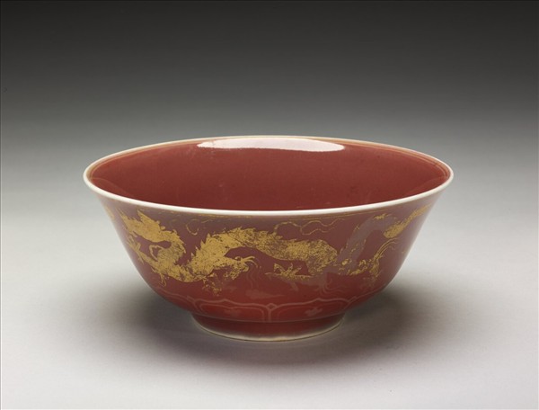撇口,弧壁,矮圈足。全器紋飾均以金彩繪成,外壁畫雙龍趕珠,間飾雲紋,底邊蓮瓣紋一周,紋飾間加飾金線六道。碗心飾一雲龍,外加雙金圈。紅釉呈色較暗為祭紅色系,口、足均露「燈草白」邊一道,足白邊泛青。胎骨厚重,圈足露胎處,質堅細膩。