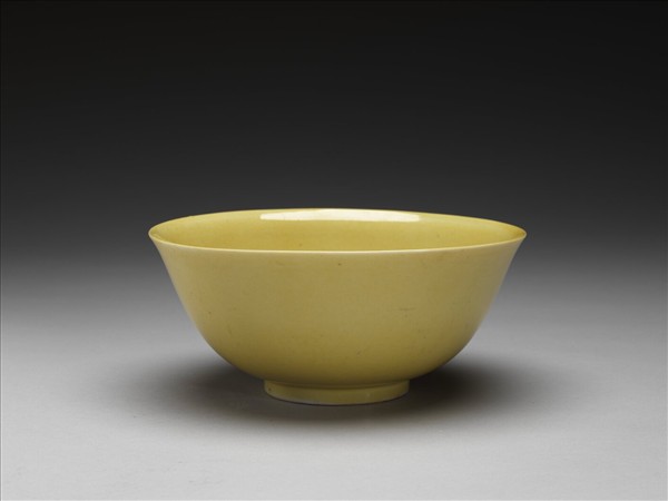 侈口,深壁,矮圈足。胎質較薄,內外滿施嬌黃釉,樸素無紋飾。底有青花書「大明弘治年製」六字二行楷款,外加雙圈。