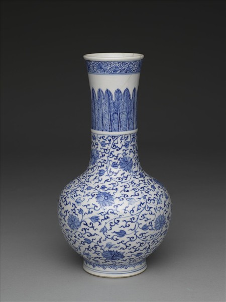 敞口,長頸,圓腹,圈足。口沿繪花葉紋一圈,頸中以兩道青線為間隔,上繪蕉葉紋一圈,下至腹部則滿繪纏枝番蓮紋。底邊飾三角蕉葉紋一周,下飾青線二道。圈足露白胎,底施白釉,以青花書「大明宣德年製」六字二行楷款,外加雙圈。