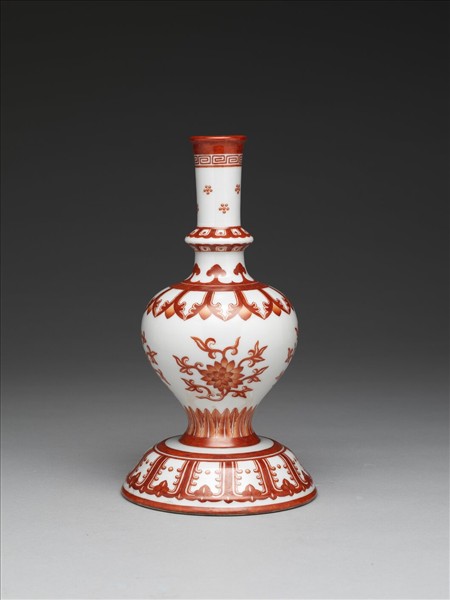 瓶形似塔,長頸,巨腹,足如覆盤。腹部畫硃紅番蓮四枝,頸、足間分畫回紋、蓮瓣、蕉葉等紋飾八層,並加飾寬窄紅線六道。