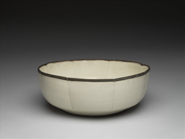 八瓣牡丹花形,敞口,深壁,圓底,矮圈足。口鑲金屬釦,釉色多灰。器底心劃游魚一尾。