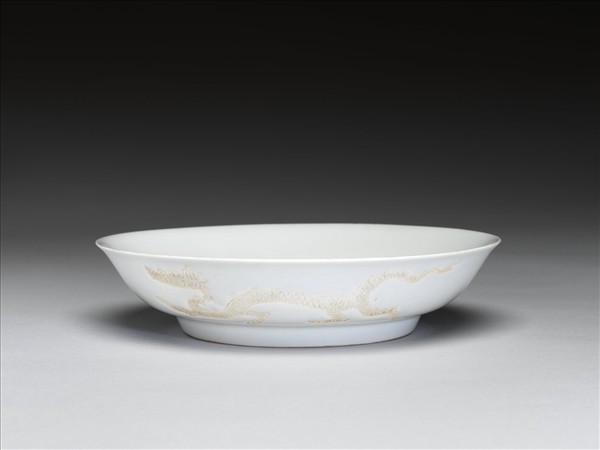 侈口,淺壁,矮圈足。盤心與外壁刻劃雲龍三條,隙地淺劃波濤、山石。內壁純白無紋飾。胎質稍厚,釉色甜白,龍紋均露胎,未施釉彩。底有青花書「大明弘治年製」六字二行楷款,外加雙圈。